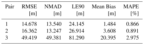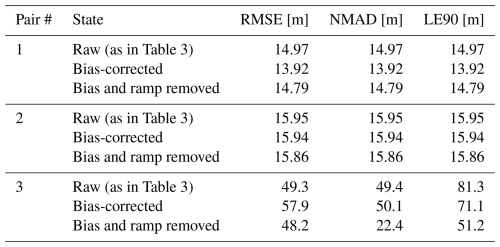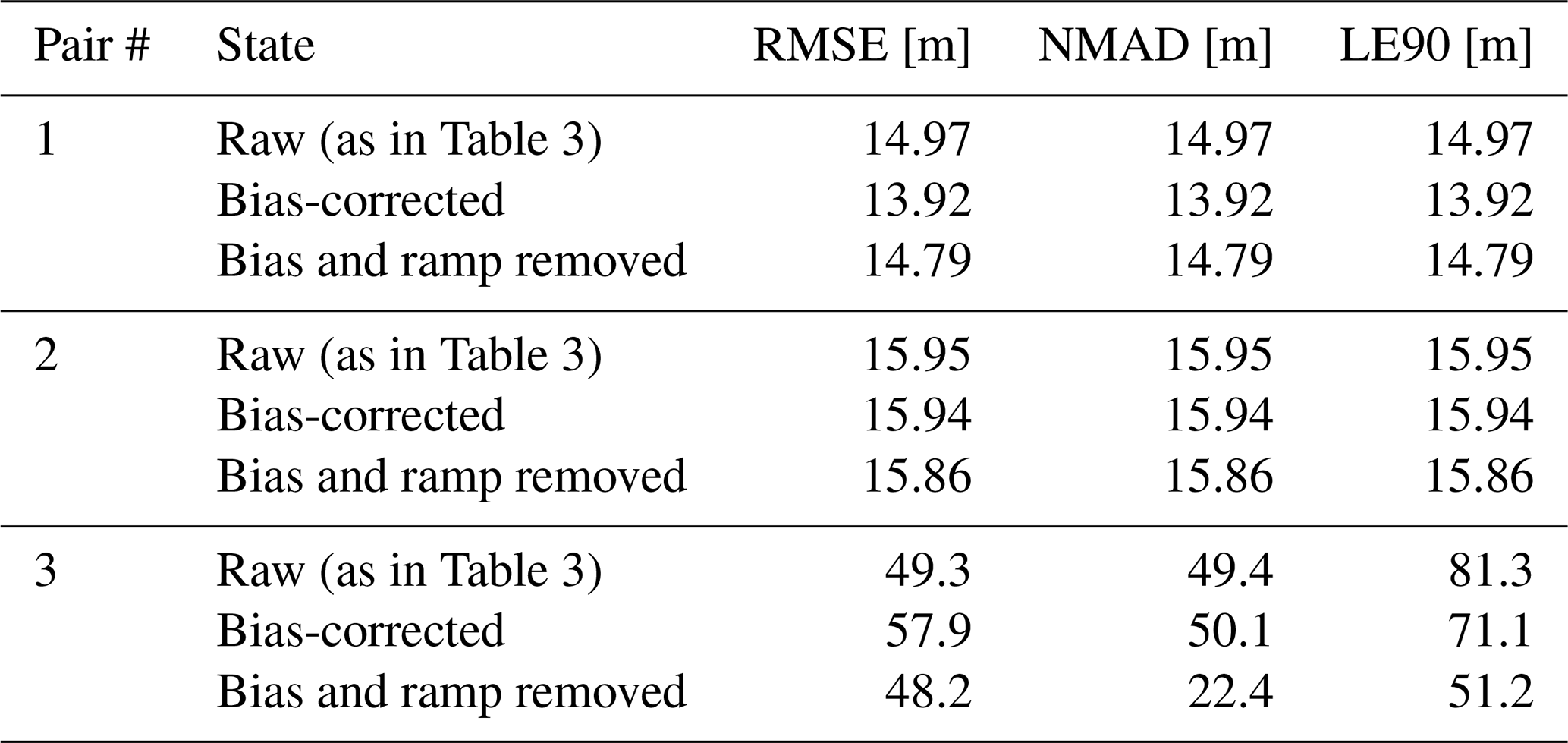 Table 4Error metrics for the digital elevation models of all three pairs before and after bias correction and ramp removal.