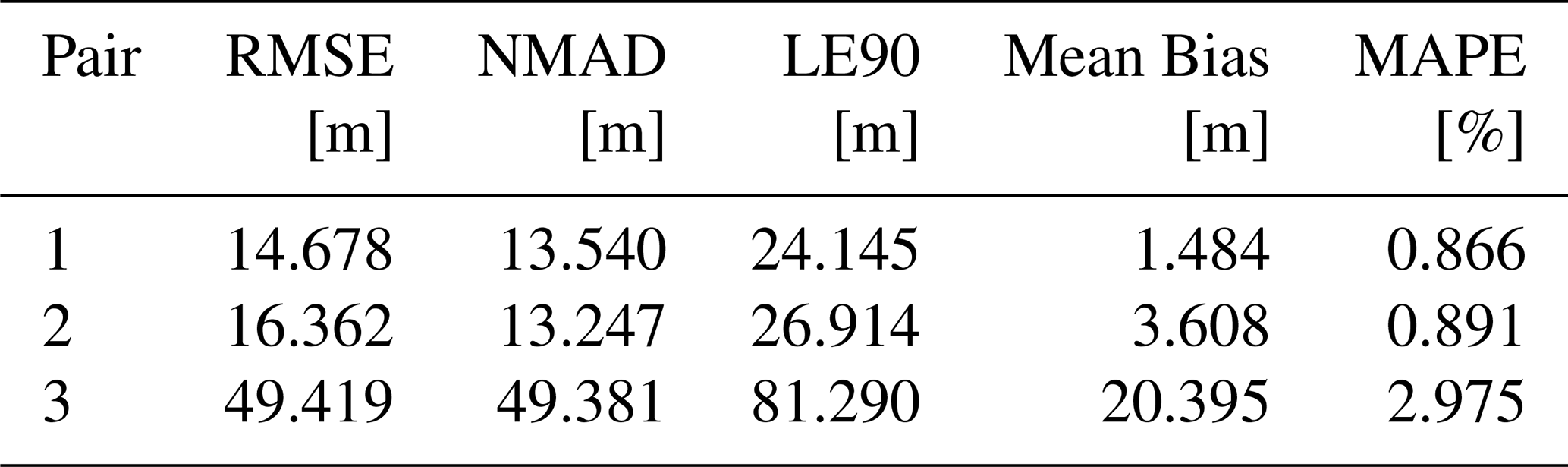 The following error metrics were computed based on the reference surface heights retrieved from the ICESat-2 mission (Sect. 2), the elevations of the three analyzed image pairs (zi), and their difference (), with n as the number of observations: